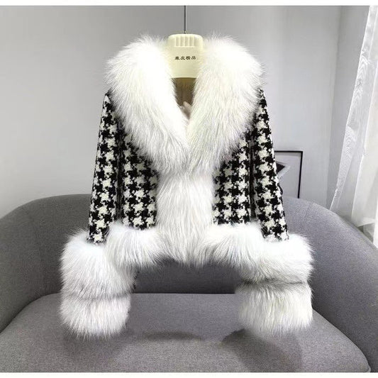 Houndstooth Faux Fur Jacket – Short Silver Fox Collar Urban Chic Coat