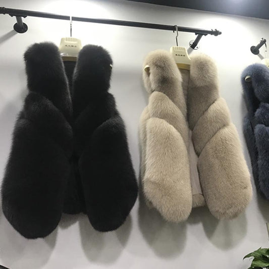 Women's Luxury Mid-Length Faux Fox Fur Vest | Plush Winter Sleeveless Coat in Chic Neutrals