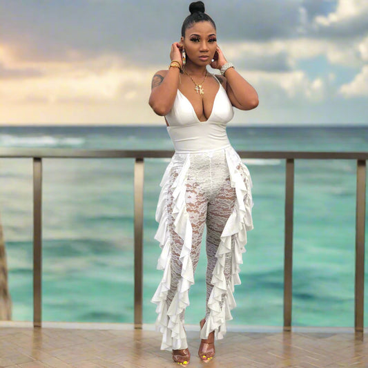 Fierce & Flawless: V-Neck Ruffle Lace Jumpsuit – Sheer Glam Edition