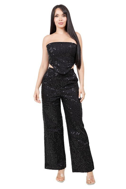 Sequin Denim 2-Piece Set – Strapless Corset Top & Distressed Pants