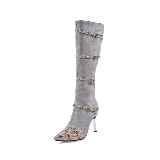 Women's Snake Print High Heel Stiletto Boots – Side Zipper Pointed Toe Knee-High