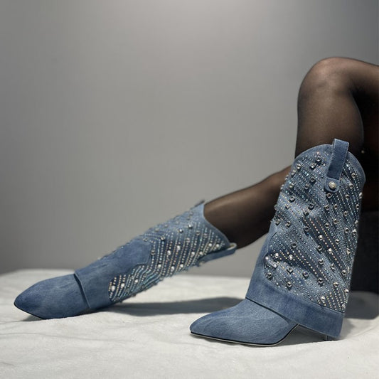 Rhinestone Denim Stiletto Boots – Pointed Toe Mid-Calf Glam