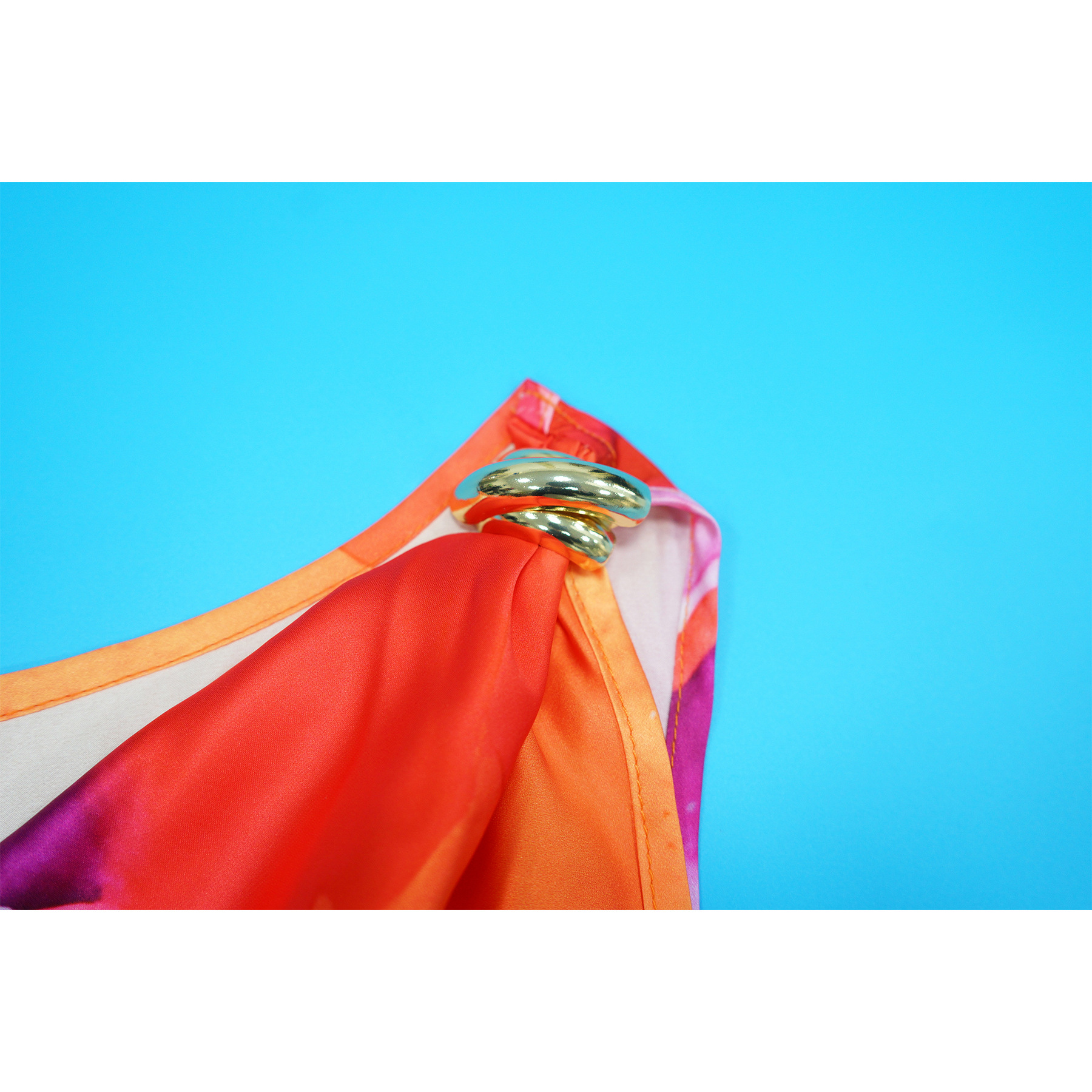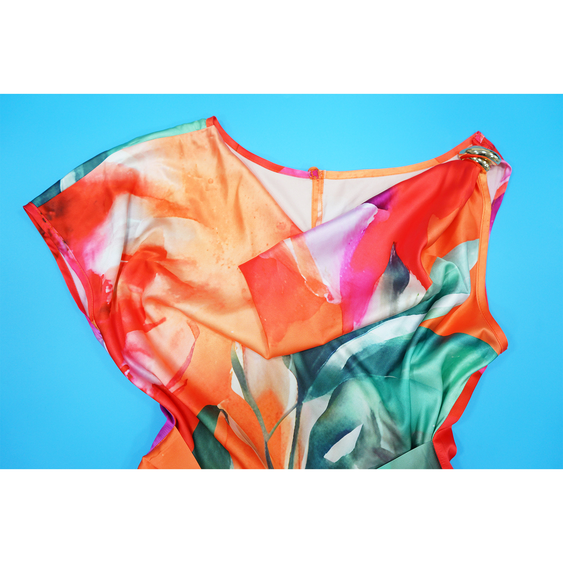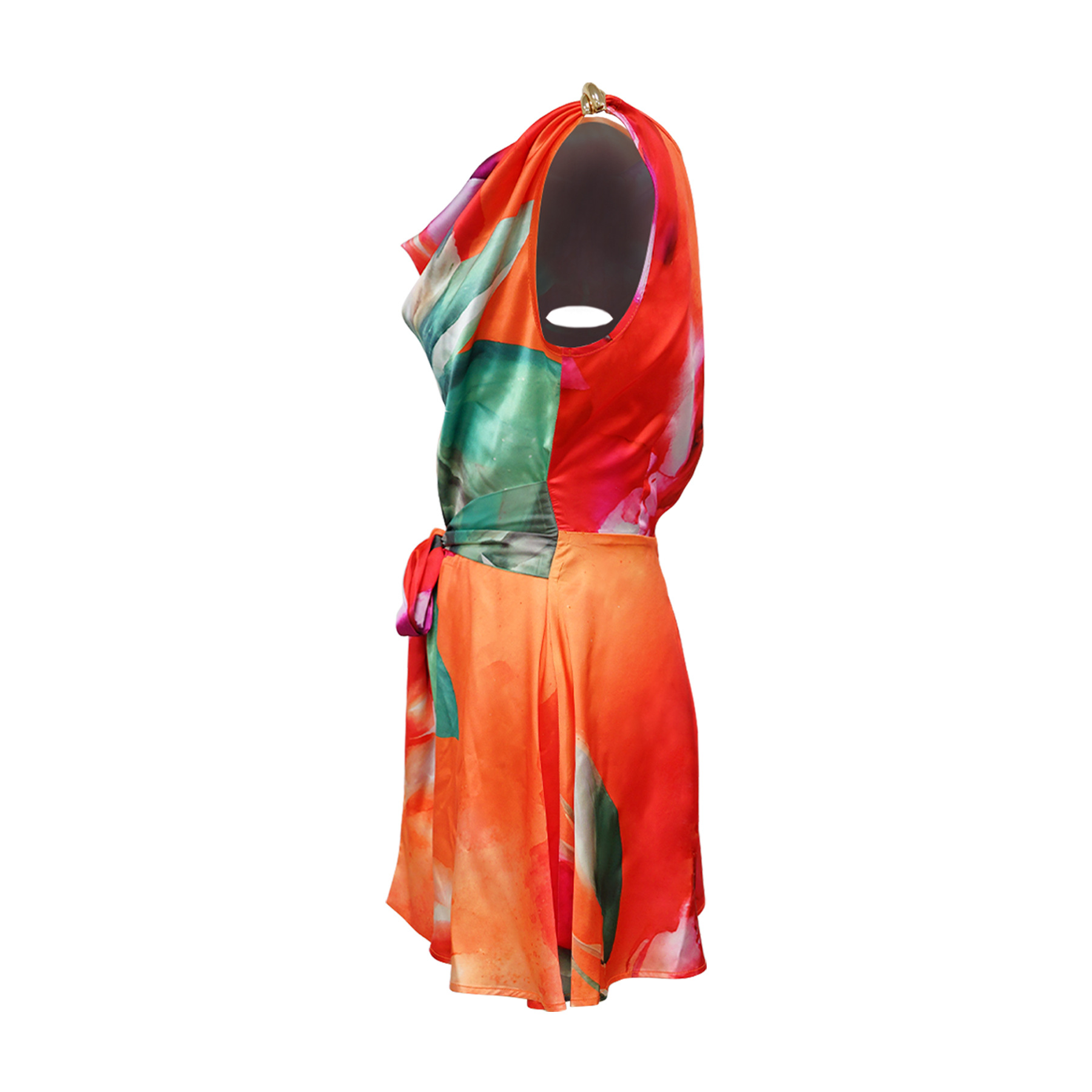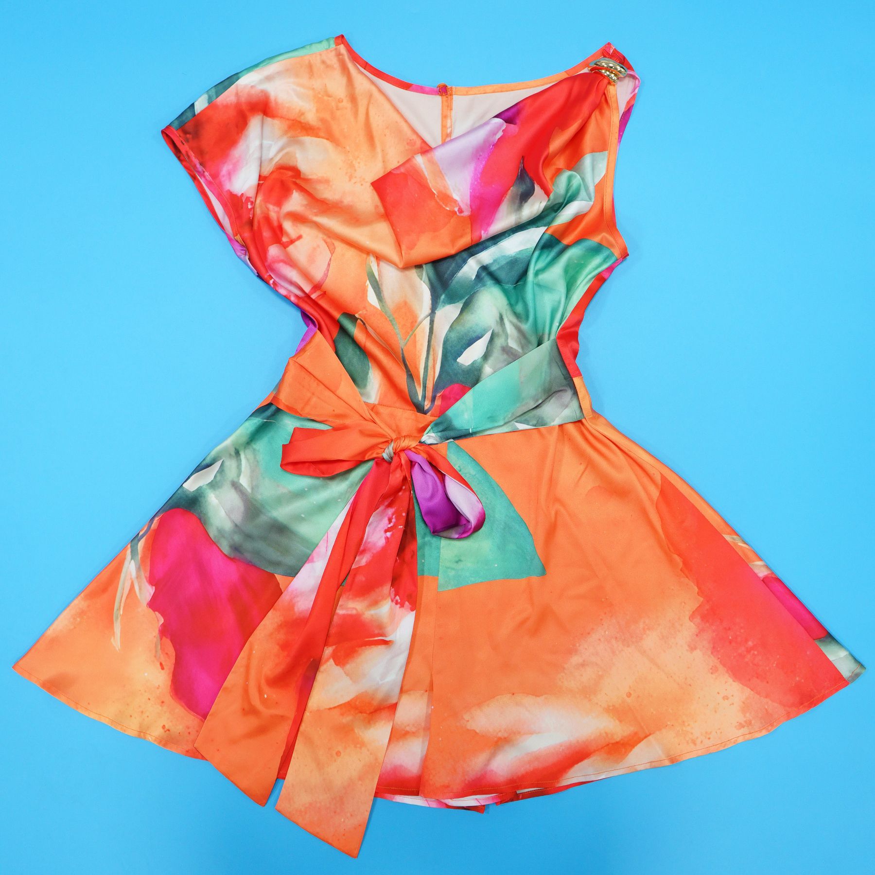 Crafted from a lightweight, satin-like polyester blend, it’s soft against the skin and ultra-breathable—perfect for rooftop nights, summer brunches, or a stylish vacation getaway. The vivid watercolor-inspired print melts sunset reds, fiery oranges, and tropical yellows together like a walking masterpiece. And with its flared hemline and sleek sleeveless cut, you’ll command attention at every angle.