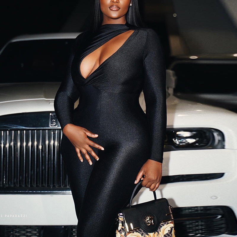 🖤 Cutout Long Sleeve Skinny Jumpsuit – Curve-Hugging Mid-Waist Fit