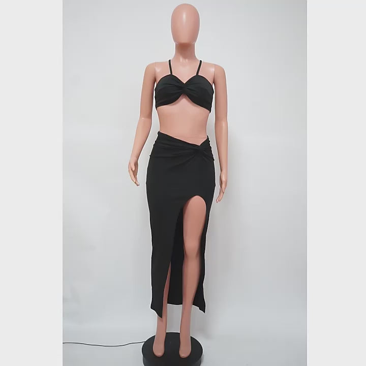 Ladies Pleated 2-Piece Halter Crop Top & Slit Maxi Skirt Set