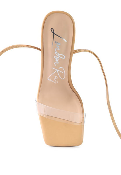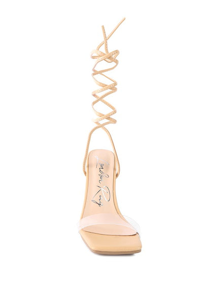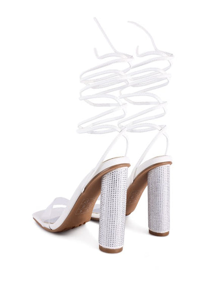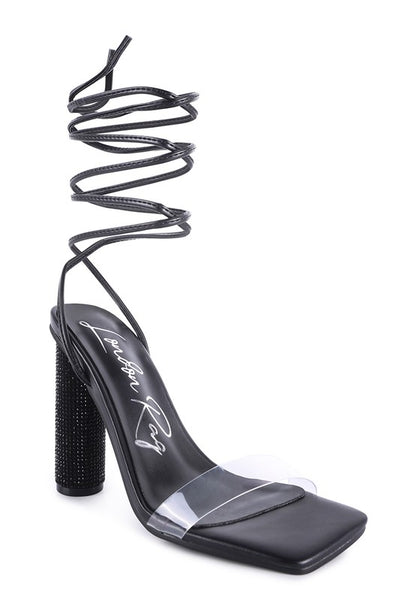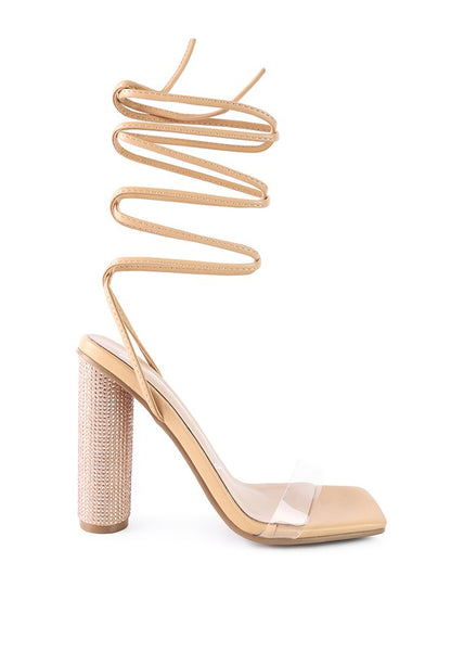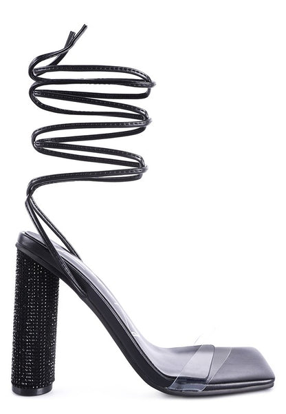 High Heeled sandal with cylindrical block heel with studded crystal diamante. The clear strap high heel lace-up sandal looks stylish.