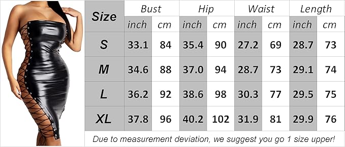 Turn heads and elevate your night-out look with this daring Strapless Faux Leather Bodycon Midi Dress. Designed to sculpt your curves, this dress features bold lace-up sides for a sultry, skin-baring effect and a sleek, wet-look finish. The strapless neckline and mid-length cut create the perfect balance of sexy and sophisticated, making this piece ideal for parties, club nights, or fashion-forward streetwear moments.