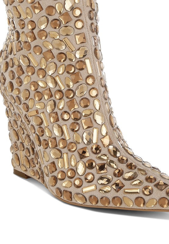 The boots have such an interesting silhouette with the slim wedge heel which looks ravishing while the diamante embellishments are dazzling and gorgeous. The pointy toe boots are a maximalist dream and would definitely be the talk of the party!
