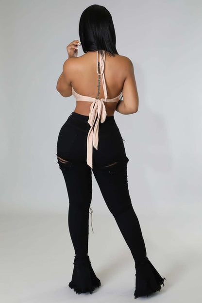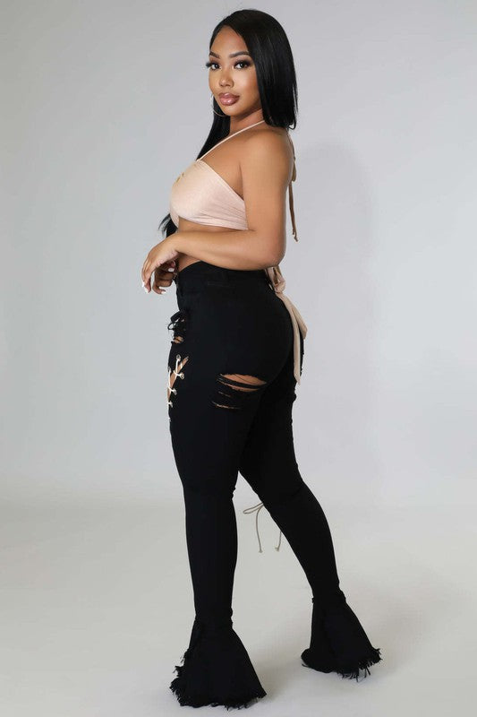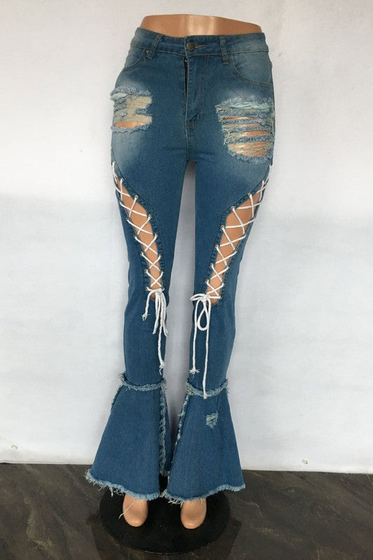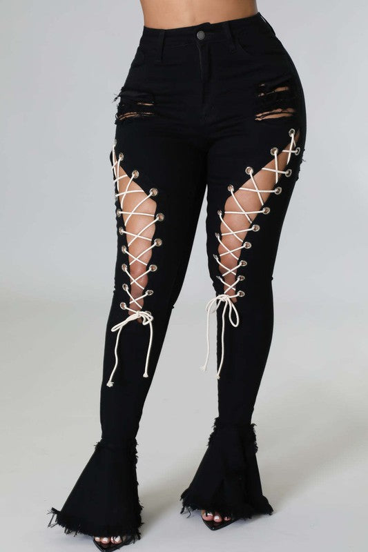Details- skinny denim pants, belt loops, multi cut off look, front lace up design