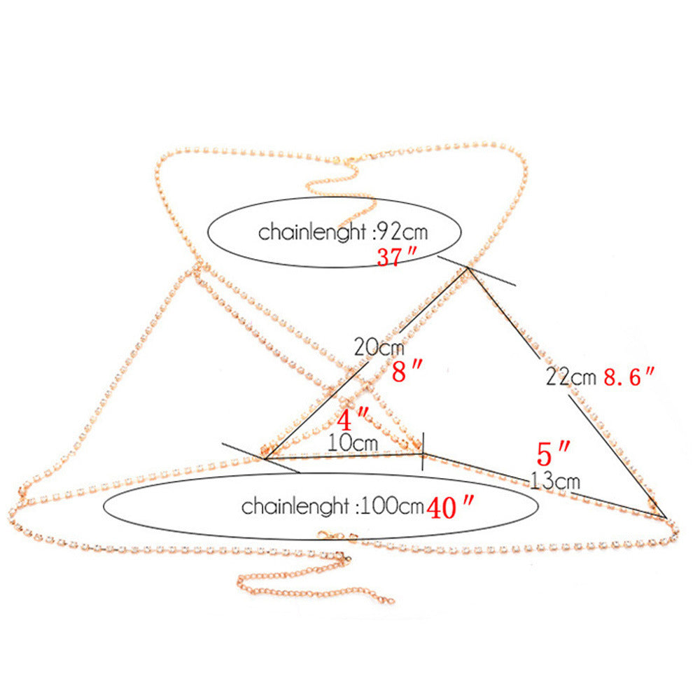 This dazzling harness-style chain features a geometric crisscross design that frames your neckline and waist in brilliant sparkle. Crafted from premium electroplated alloy, the body chain is adorned with high-quality rhinestones, catching light beautifully from every angle.