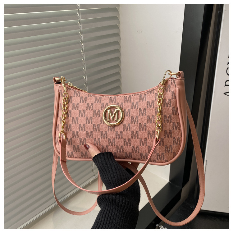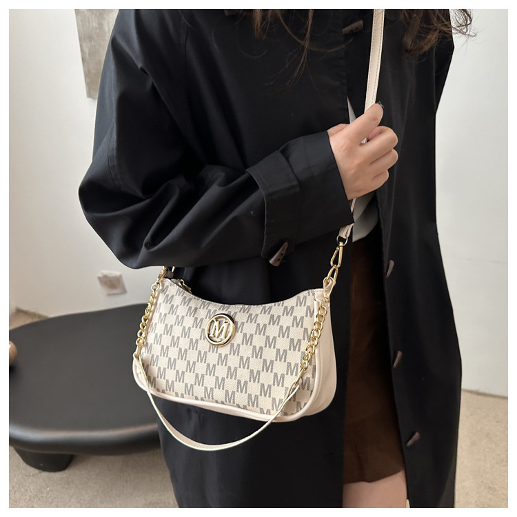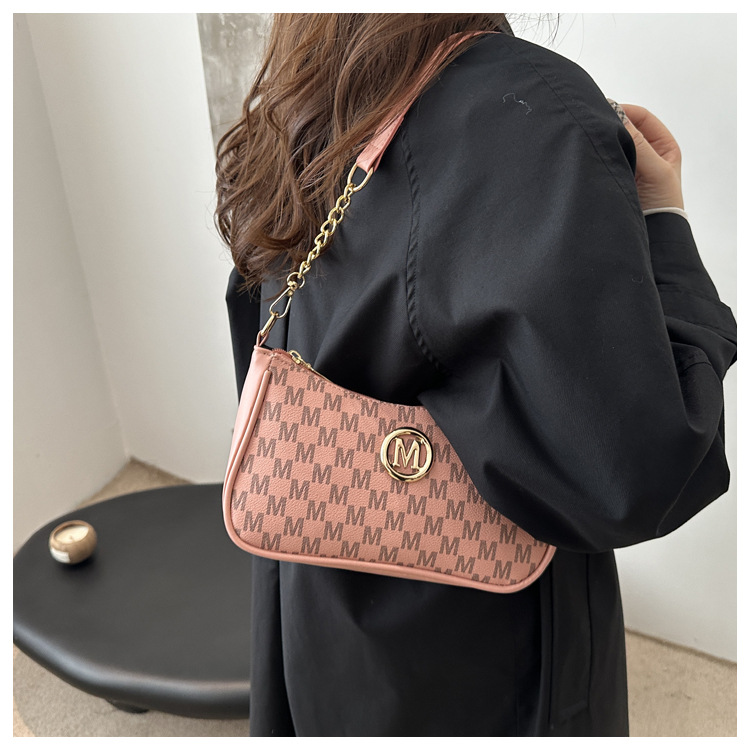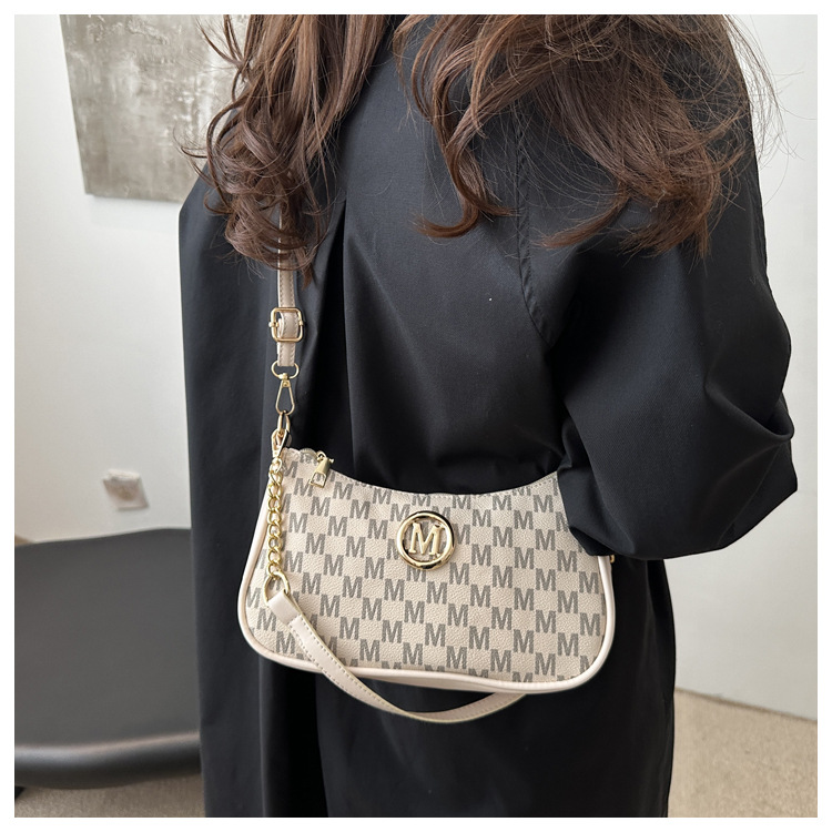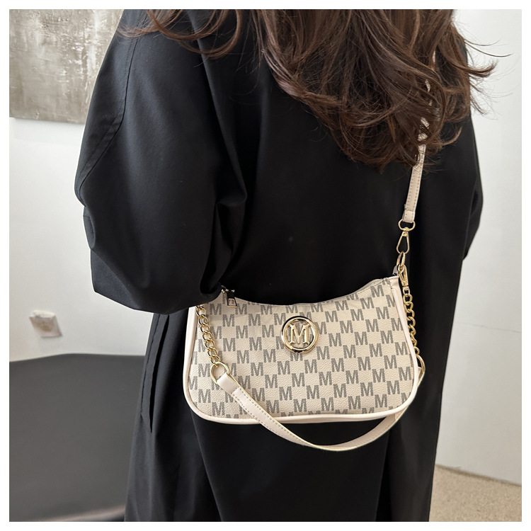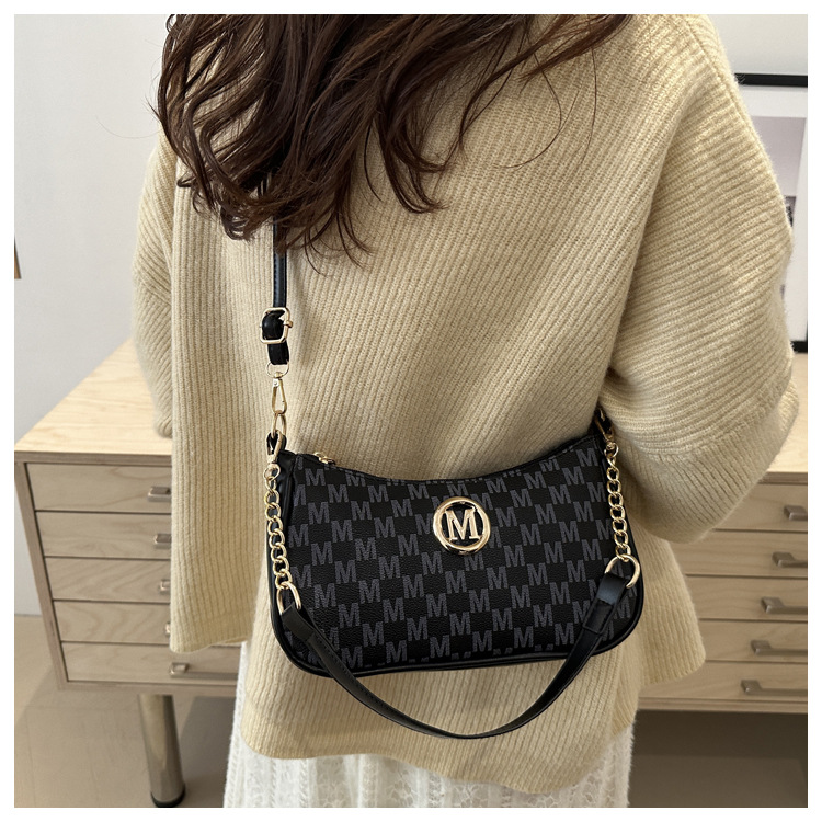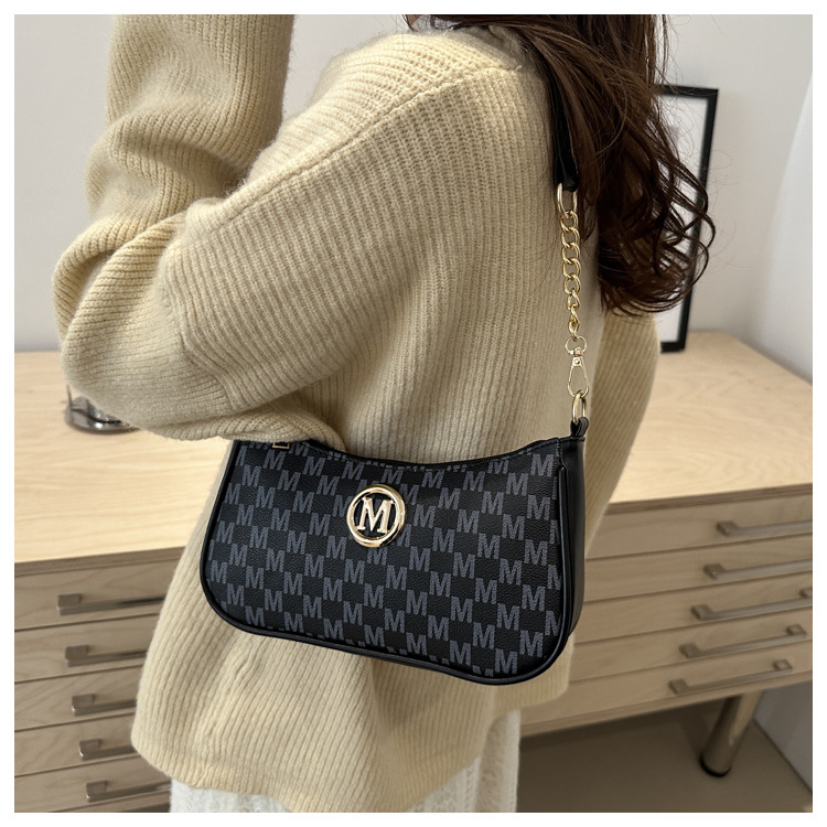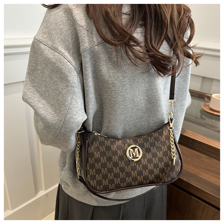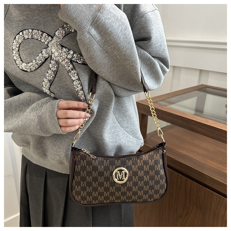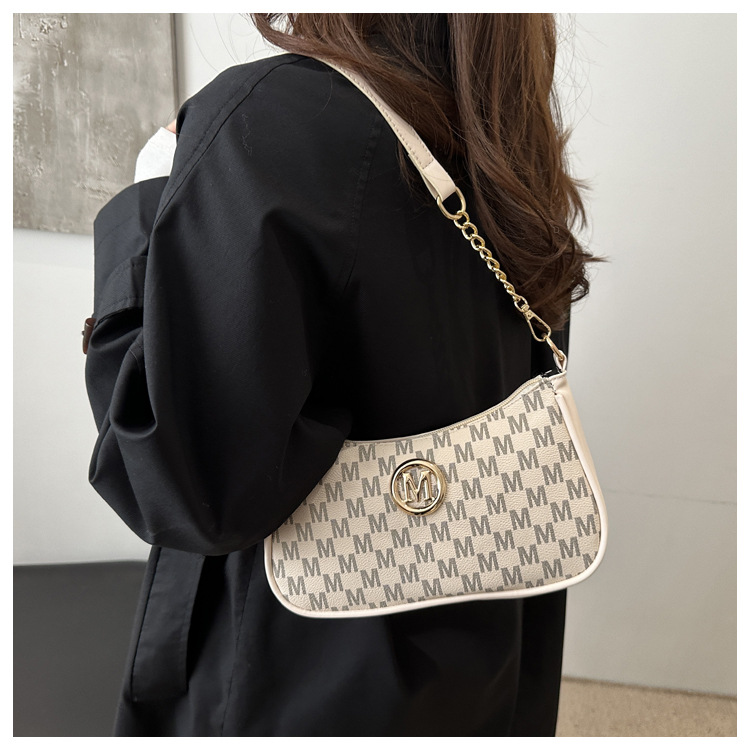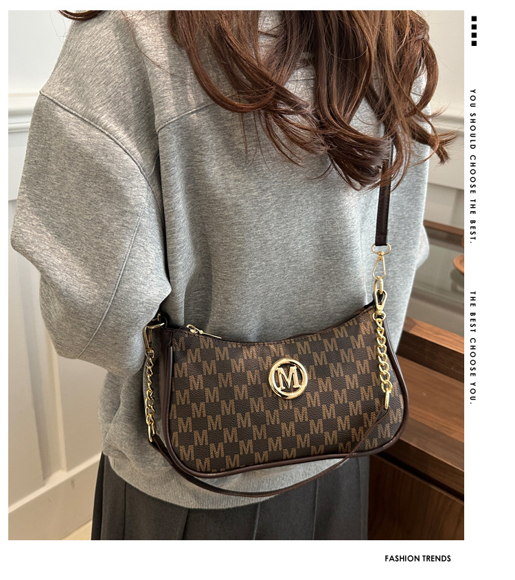 Crafted from premium PU leather with a soft yet structured dumpling silhouette, this bag features a timeless all-over monogram print accented by gold-tone chain hardware and refined stitching details. The sleek underarm profile transitions seamlessly from casual daytime looks to elevated evening outfits.