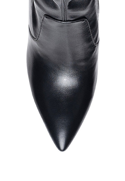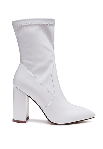 This over the ankle boot in pointed toe looks sharp and has the trendy block heels. Comes with side zipper opening for easy to wear feature.